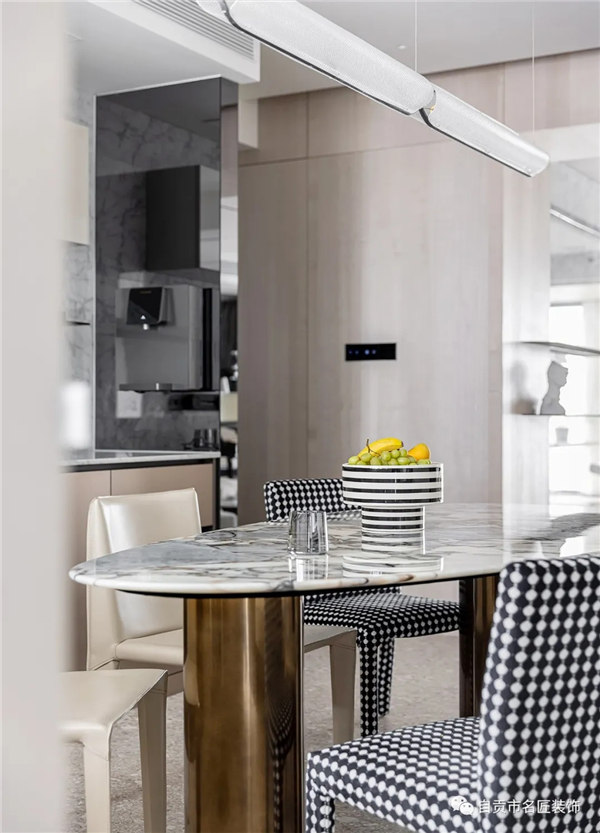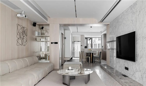 全屋采用無主燈和局部線性燈光設(shè)計,營造放松、溫馨氛圍,整體以白色、淺色的木飾面為主,搭配小面積的鏡面穿插,融合自然紋理的石材點綴,通過對材質(zhì)、細節(jié)的整合把控,進一步達到對空間本身的塑造以讓心靈找到歸屬