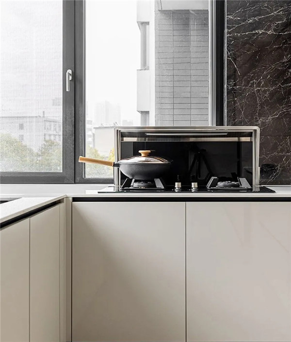 廚房整體白加黑的搭配,靜謐沉穩(wěn)的氣息,蔓延廚房的每一個角落。